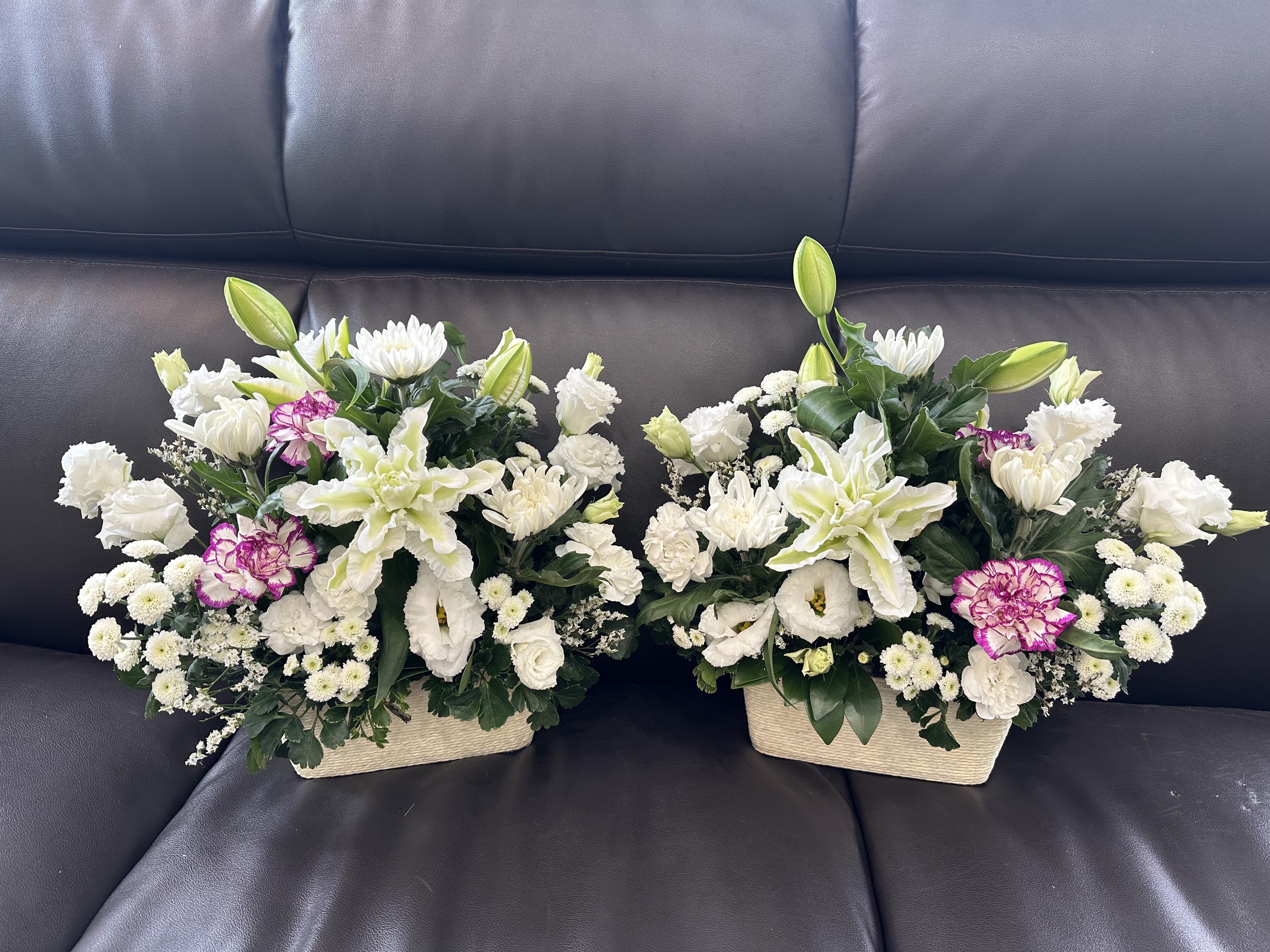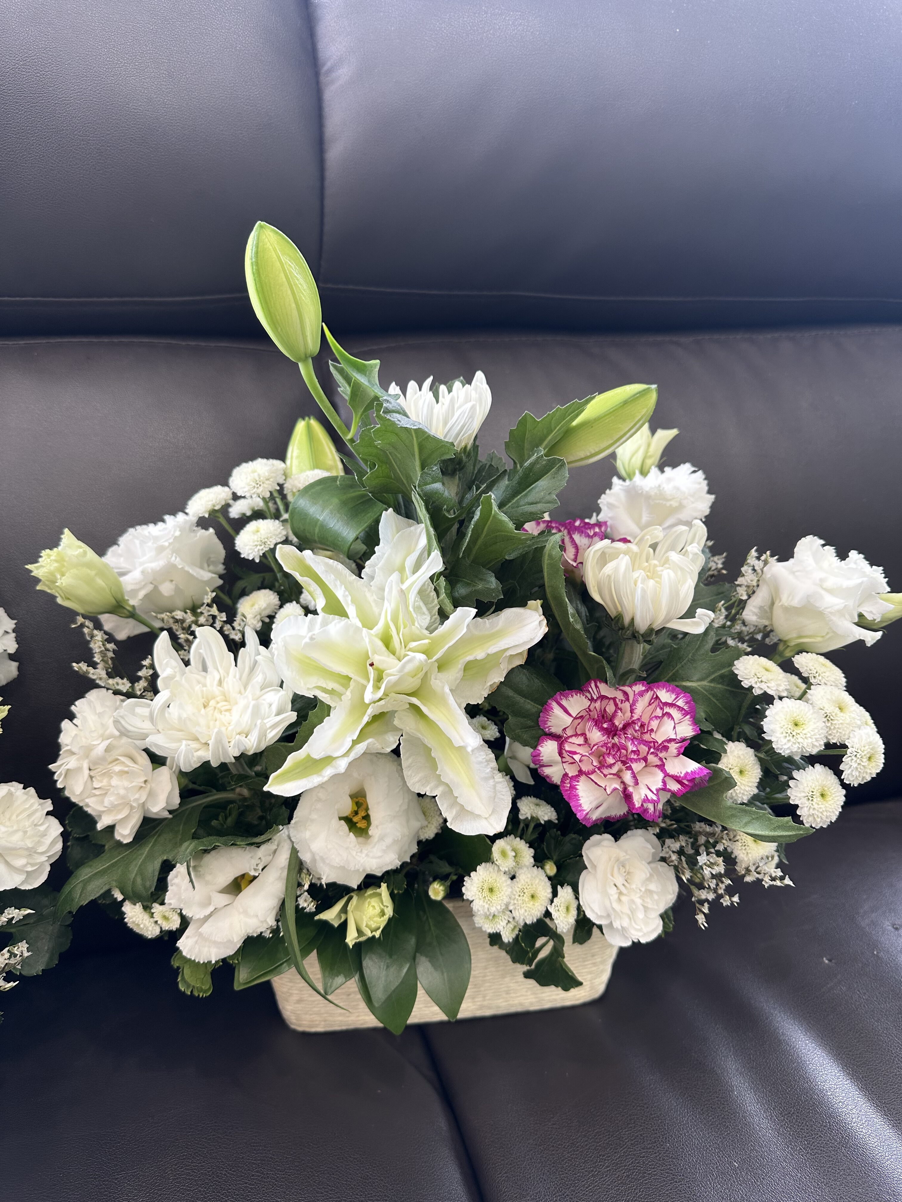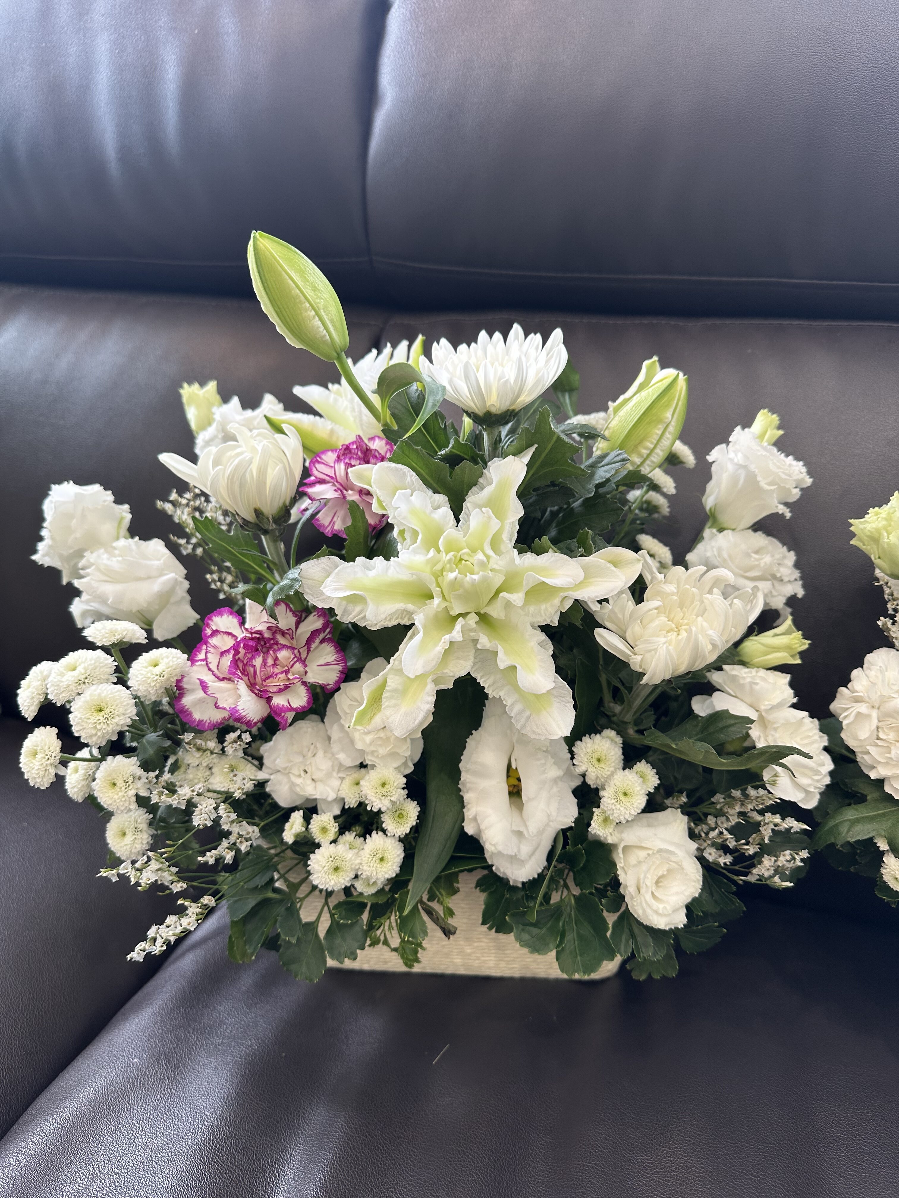 高さがあまり高くないので貧相にならない様に、出来るだけ華やか(お供えに対して適した表現ではないかもしれませんが、、)になる様に、白系でも寂しい雰囲気にならない様にお作り致しました。